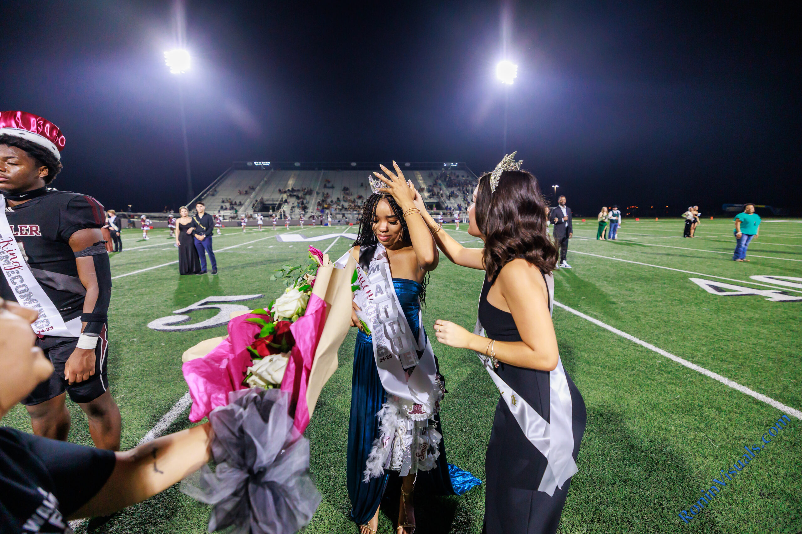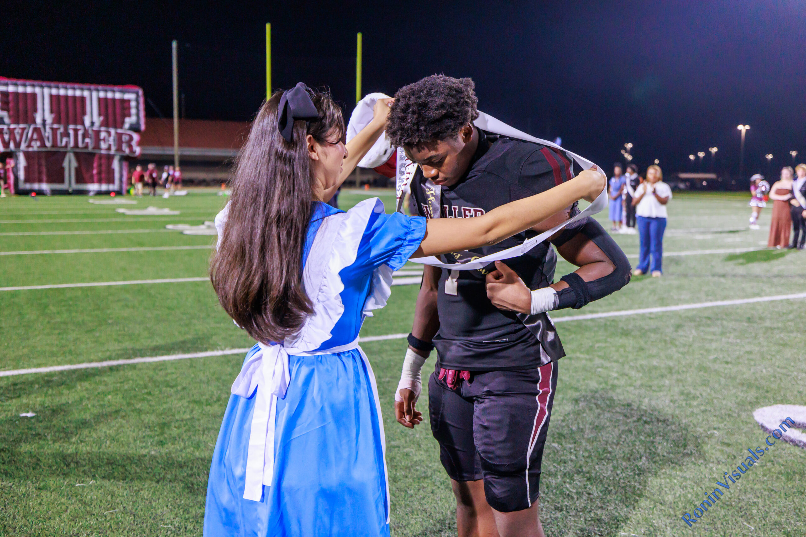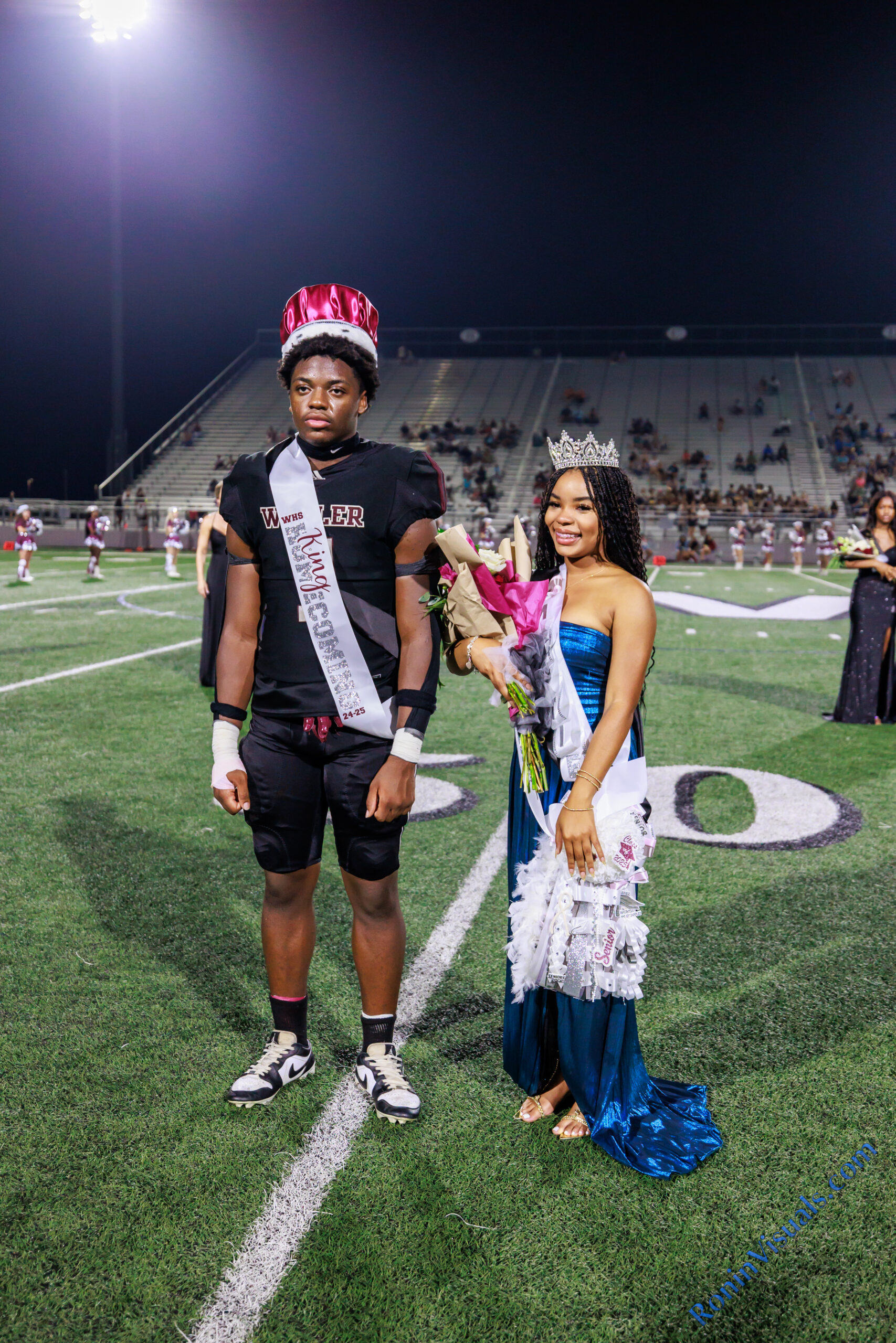 Homecoming King Thony Tshitenge and Queen Mattie Jones stand at the 50-yard line after being crowned during the halftime ceremony in Daikin Stadium on Sept. 13, 2024. The Waller Bulldog football team wins their first homecoming game in nearly a decade, over Houston Westside, for the Bulldog’s second victory of the 2024 campaign, at Daikin Stadium in Waller, Sept. 13, 2024. (Photo by Creighton Holub, courtesy RoninVisuals.com)