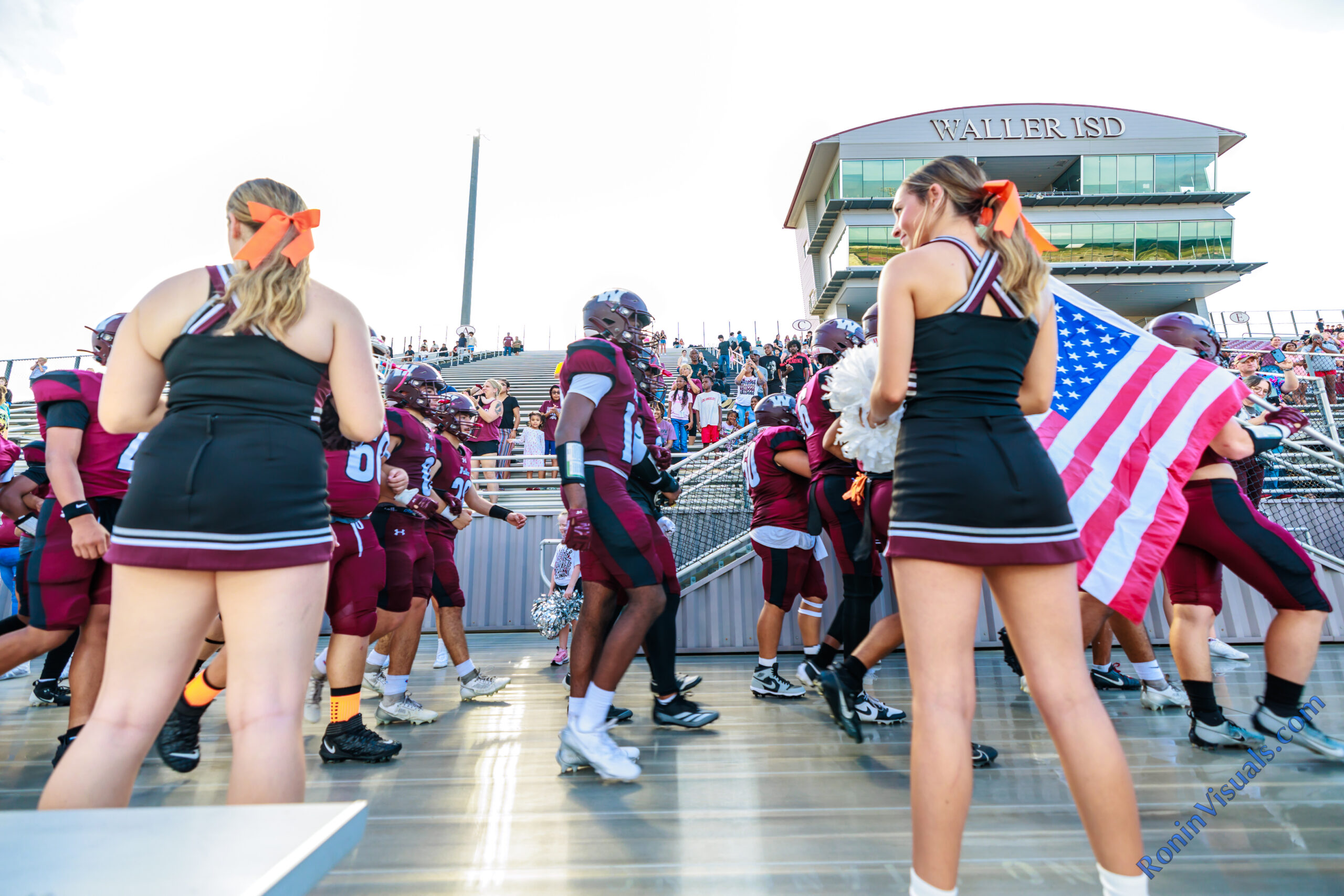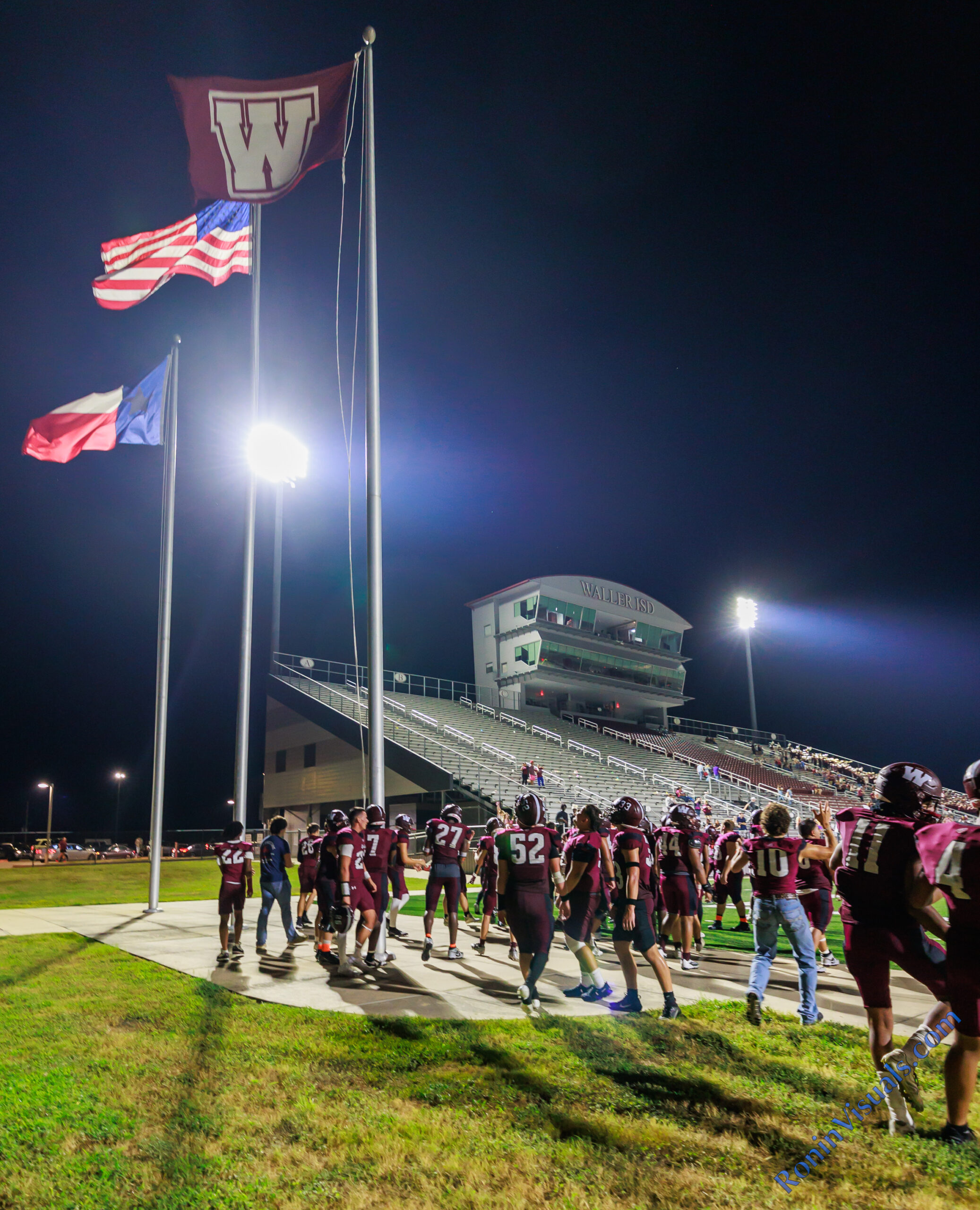 The Waller Bulldog football team takes to the field en route to defeating Conroe Caney Creek, 41-7, for the Bulldog’s first victory at home since 2021, at Daikin Stadium, Aug. 31, 2024. (Photo by Creighton Holub, courtesy RoninVisuals.com)