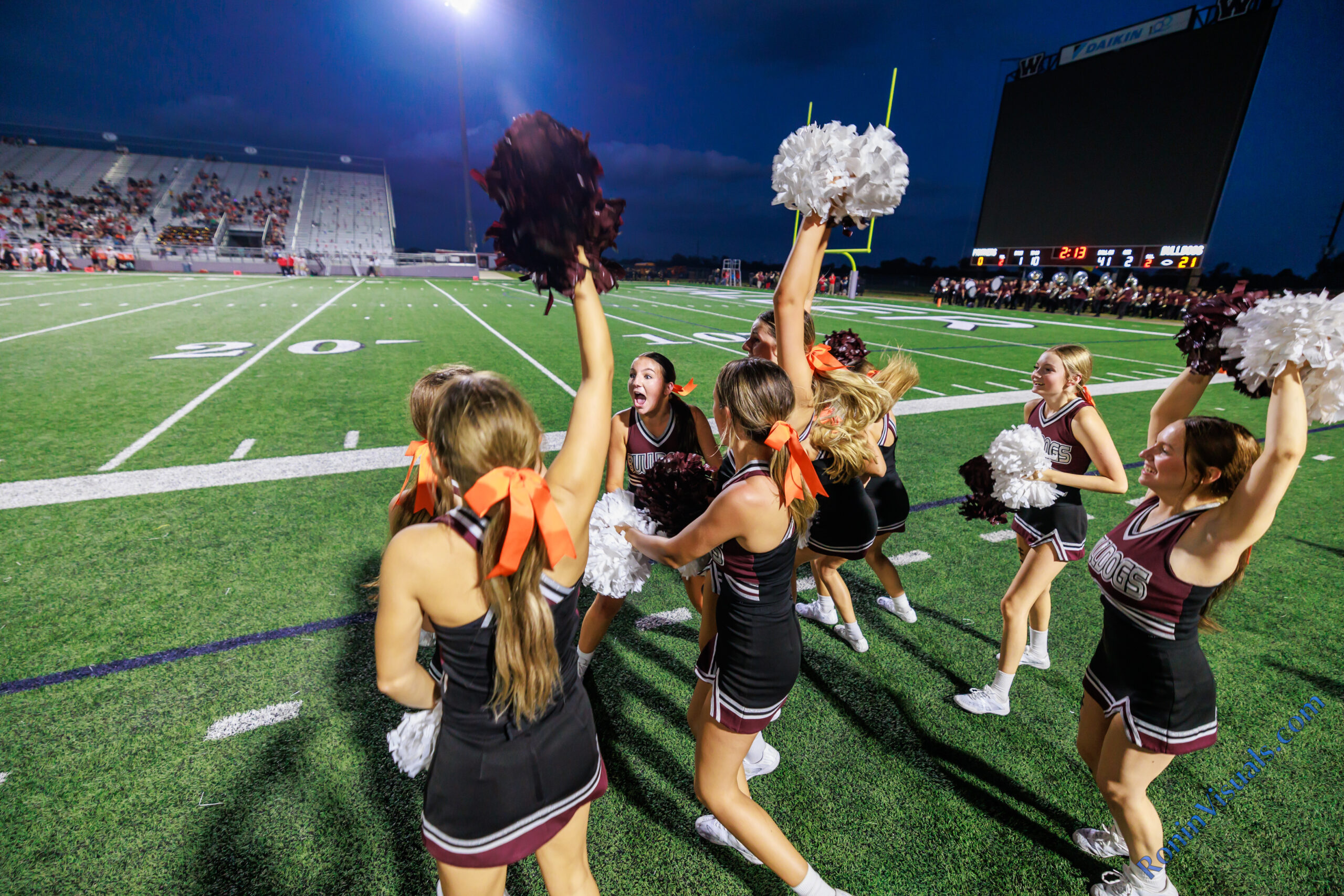 The Waller Bulldog cheerleaders explode as the football team takes a commanding lead in the eventual victory over Conroe Caney Creek, 41-7, for the Bulldog’s first victory at home since 2021, at Daikin Stadium, Aug. 31, 2024. (Photo by Creighton Holub, courtesy RoninVisuals.com)
