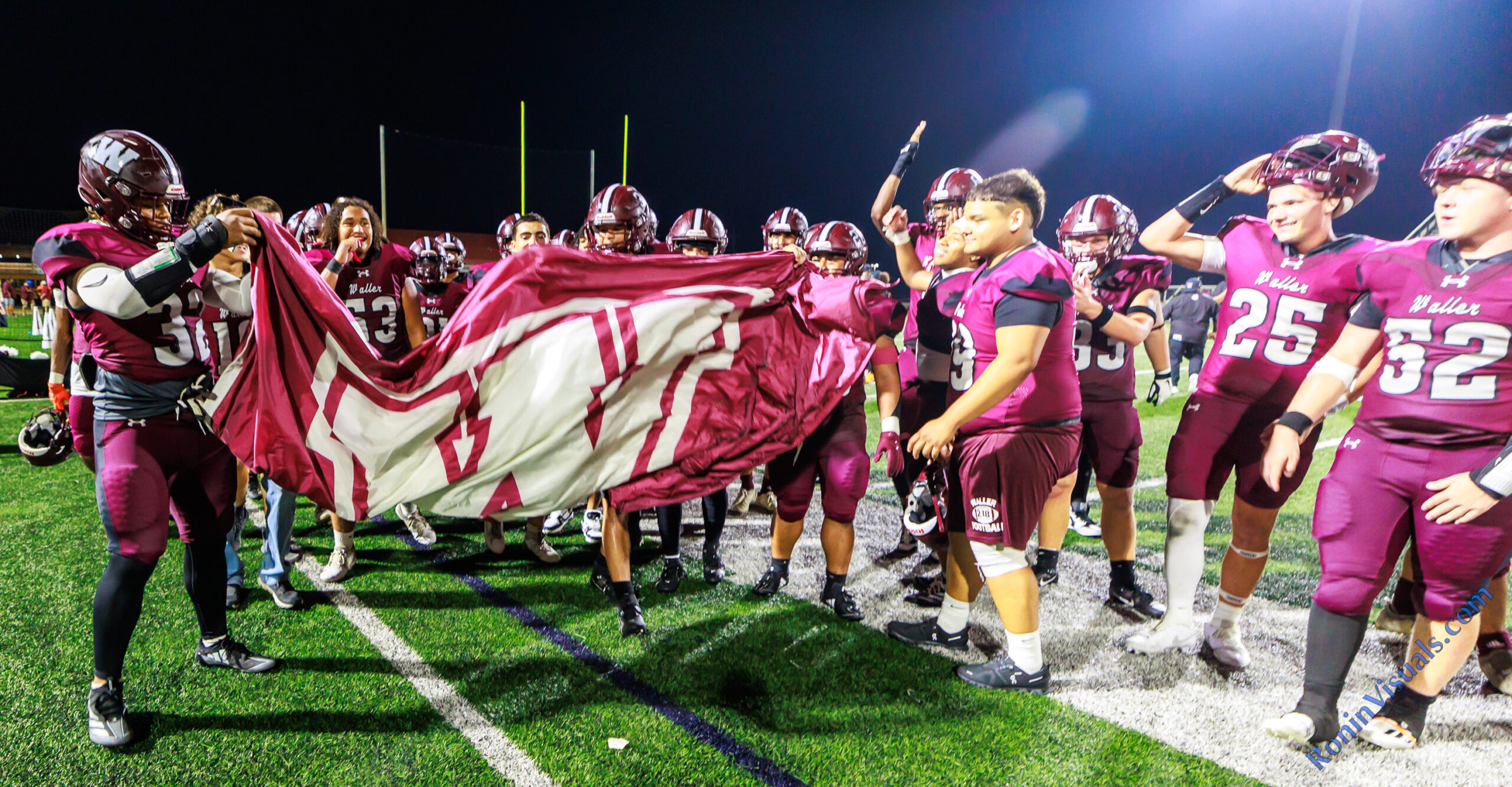 The Waller Bulldog football team raises the victory flag at home for the first time since 2021, after defeating Conroe Caney Creek, 41-7, at Daikin Stadium, Aug. 31, 2024. (Photo by Creighton Holub, courtesy RoninVisuals.com)